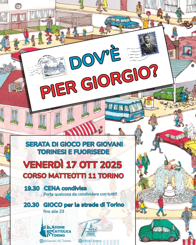 Il Settore Giovani dell’AC di Torino propone a tutti i giovani torinesi e fuorisede una serata di gioco e condivisione alla ricerca di Pier Giorgio Frassati, dal titolo “Dov’è Pier Giorgio?“.