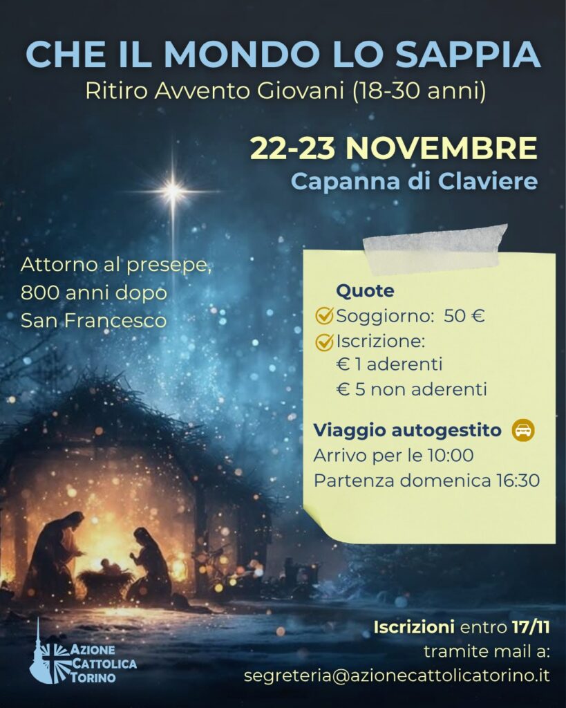 Per tutte le info e le iscrizioni utilizzare la mail segreteria@azionecattolicatorino.it entro il 17 novembre.