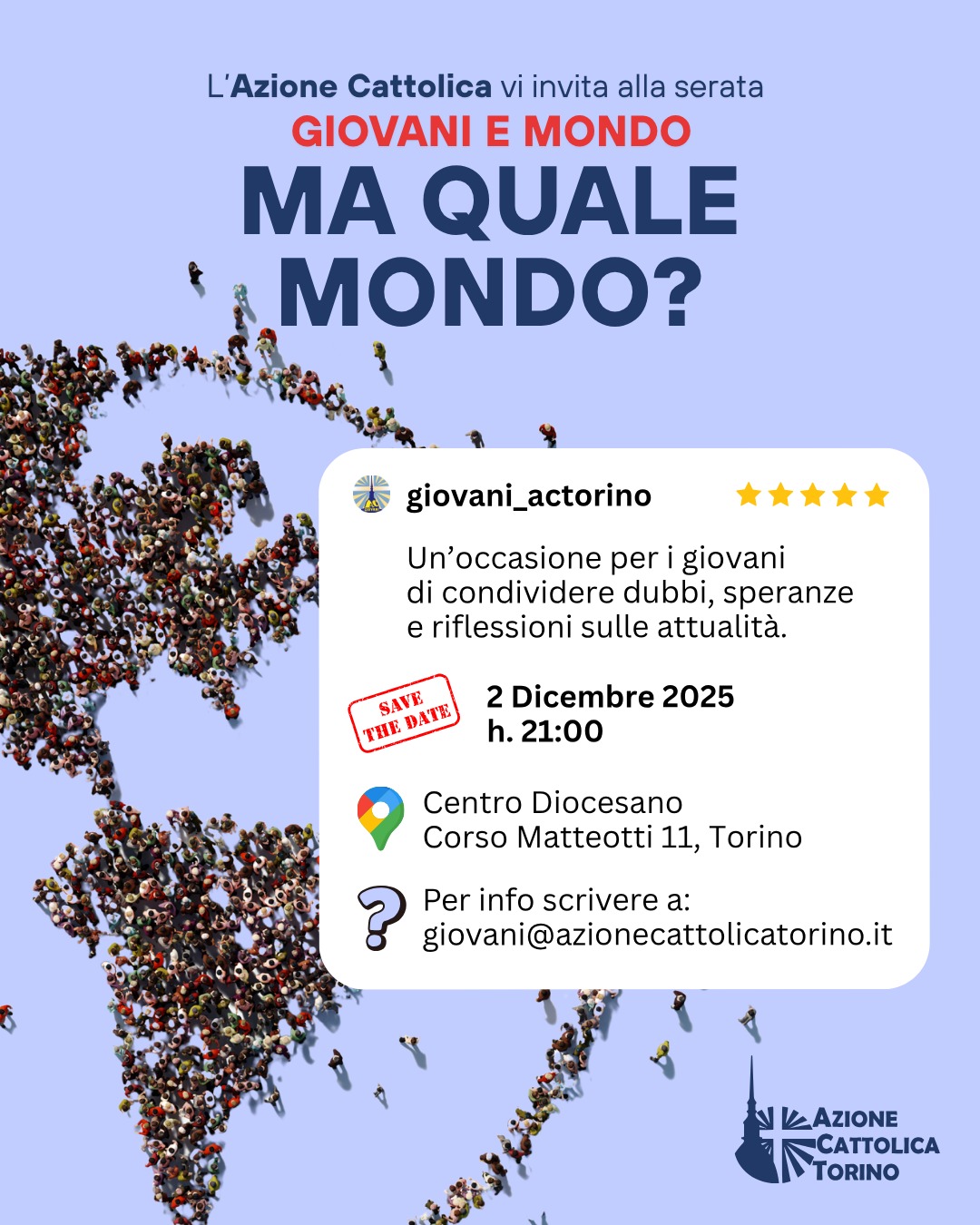 Dicembre 2 @ 21:00 - 23:00 SERATA GIOVANI E MONDO Centro diocesano Corso Giacomo Matteotti 11, Torino, Italia